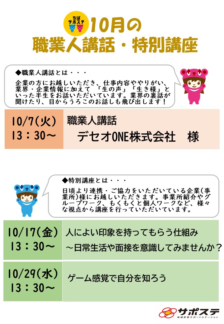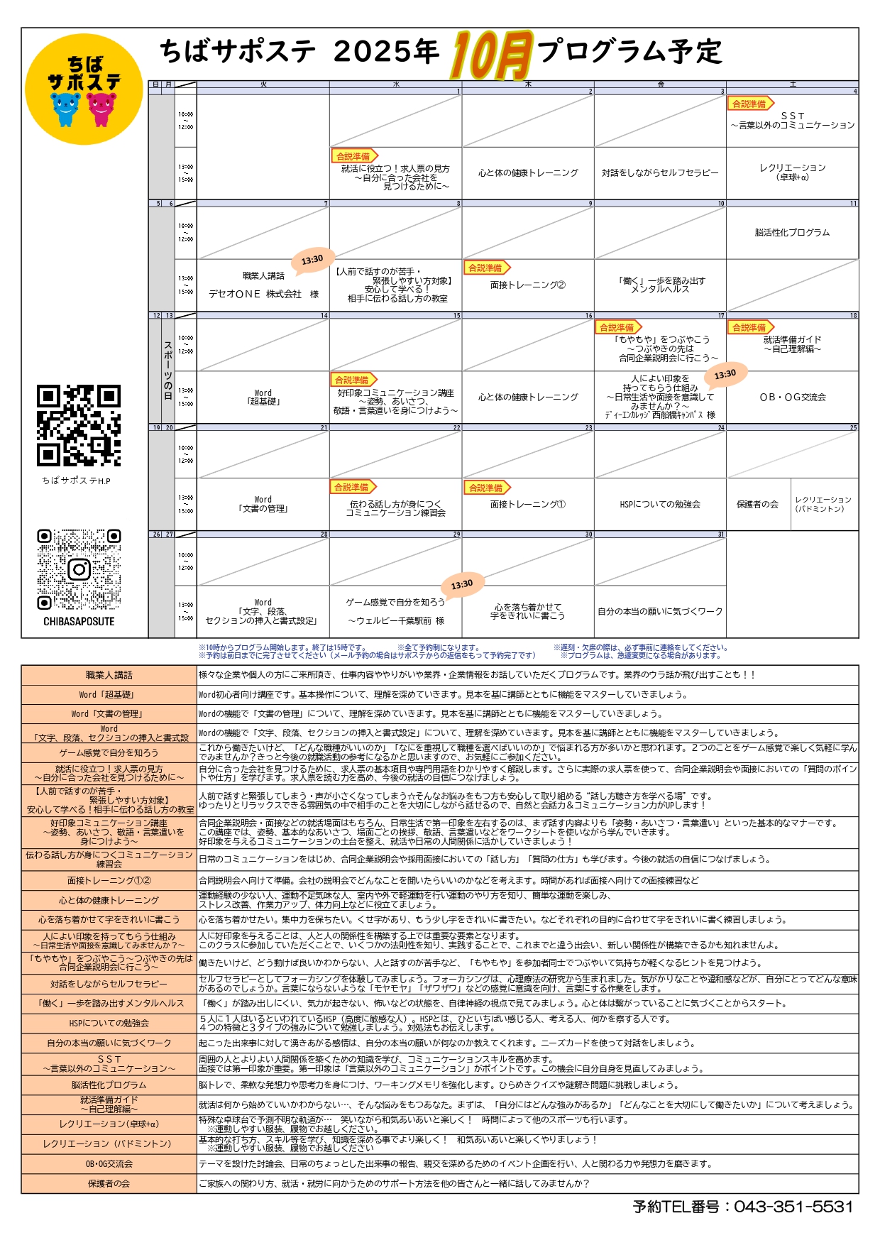 今月は、11月13日(木) ちばサポステ主催の「合同企業説明会」開催に向け 『合説準備』と題したプログラムを盛り込んだ内容となっております。 初めての合同企業説明会参加の方でも、安心して参加できる情報提供やヒント、 就職 […]