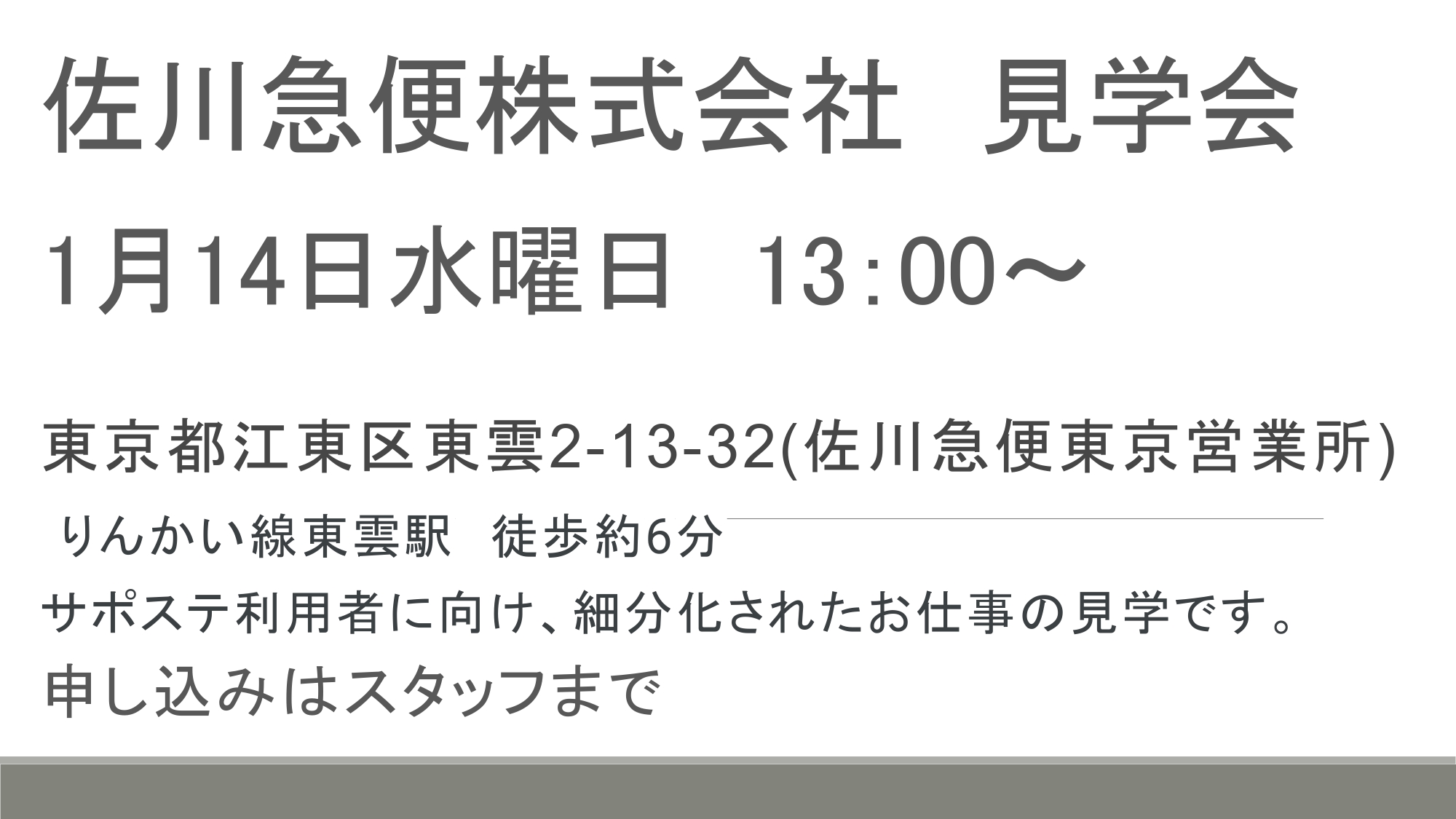 260114佐川急便見学会 イベント・プログラム新着記事 3/13(金)合同企業説明会in四街道市 開催します!! 3/7 (土)10:00~講演会のお知らせ! 2/21(土)10:00~家族向けセミナーを開催します! 2月の職業人講話/特別講座のお知らせ ブログ新着記事 【なりたい姿を考える】特別講座開催いたしました!~プログラム通信 「自分を知ろう!自分に合った将来~自分を説明する」特別講座開催いたしました!~プログラム通信 新しい風!「声で広がる新しい自分」開講!~プログラム通信 ちばサポステについて「ChatGPTにブログを書いてもらったら…」