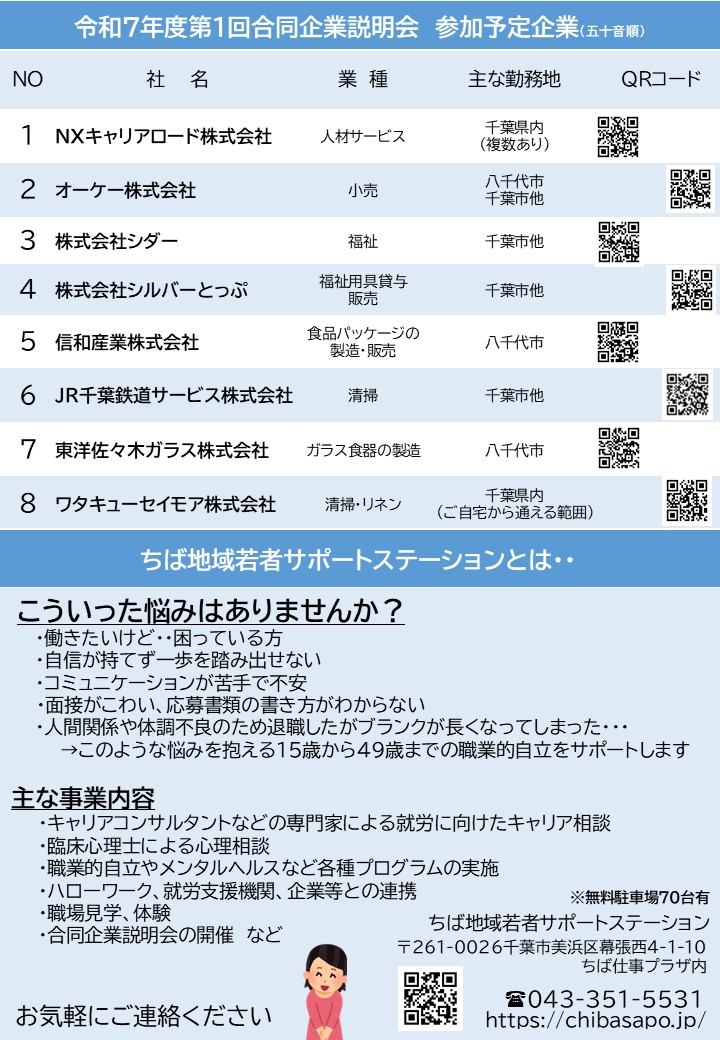 ちばサポステでは、就労を目指す15歳~49歳までの方を対象に「働くこと」に向けての支援を行っています。 就活中の方はもちろん、働く一歩を踏み出したい方向けの合同企業説明会を年に数回行っており、採用、育成に熱意のある […]