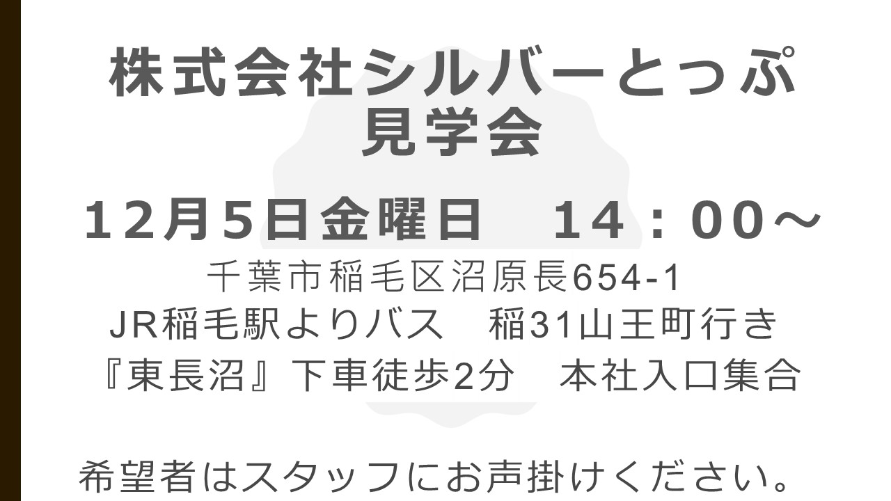 (株)シルバーとっぷ様 の見学会を開催します。 日時:12/5(金)14:00~ ※オフィスカジュアル推奨です。 ご希望の方は、スタッフまでお問合せ・ご予約ください。
