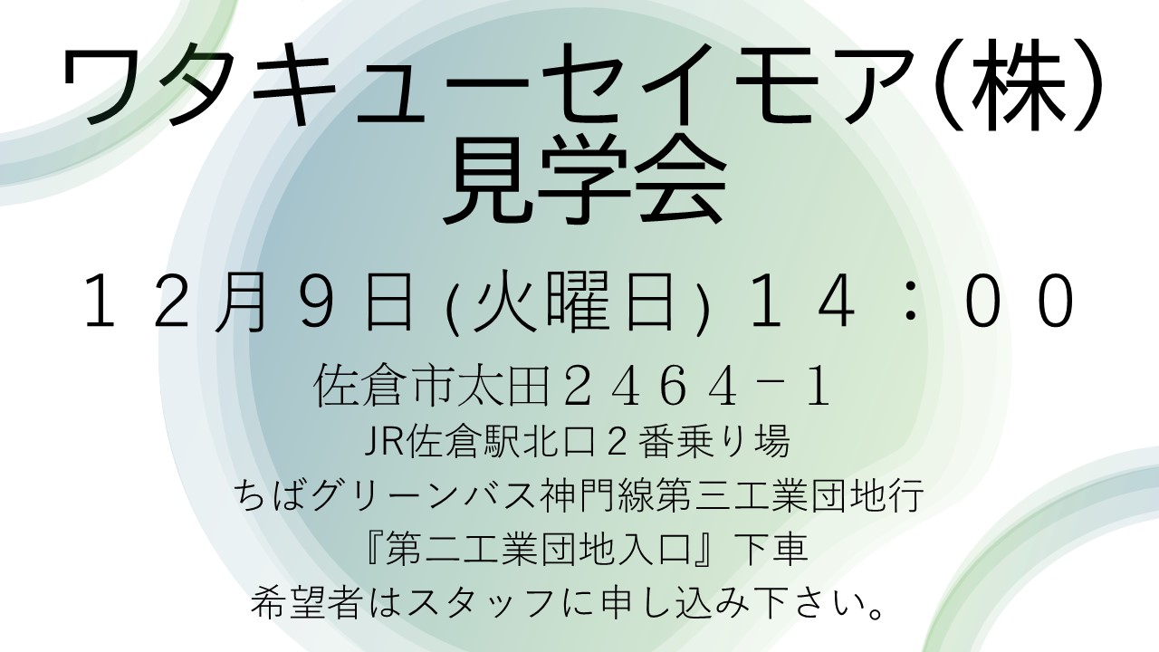 ワタキューセイモア(株)様 の見学会を開催します。 日時:12/9(火)14:00~ ※現地集合となります。 ご希望の方は、スタッフまでお問合せ・ご予約ください。