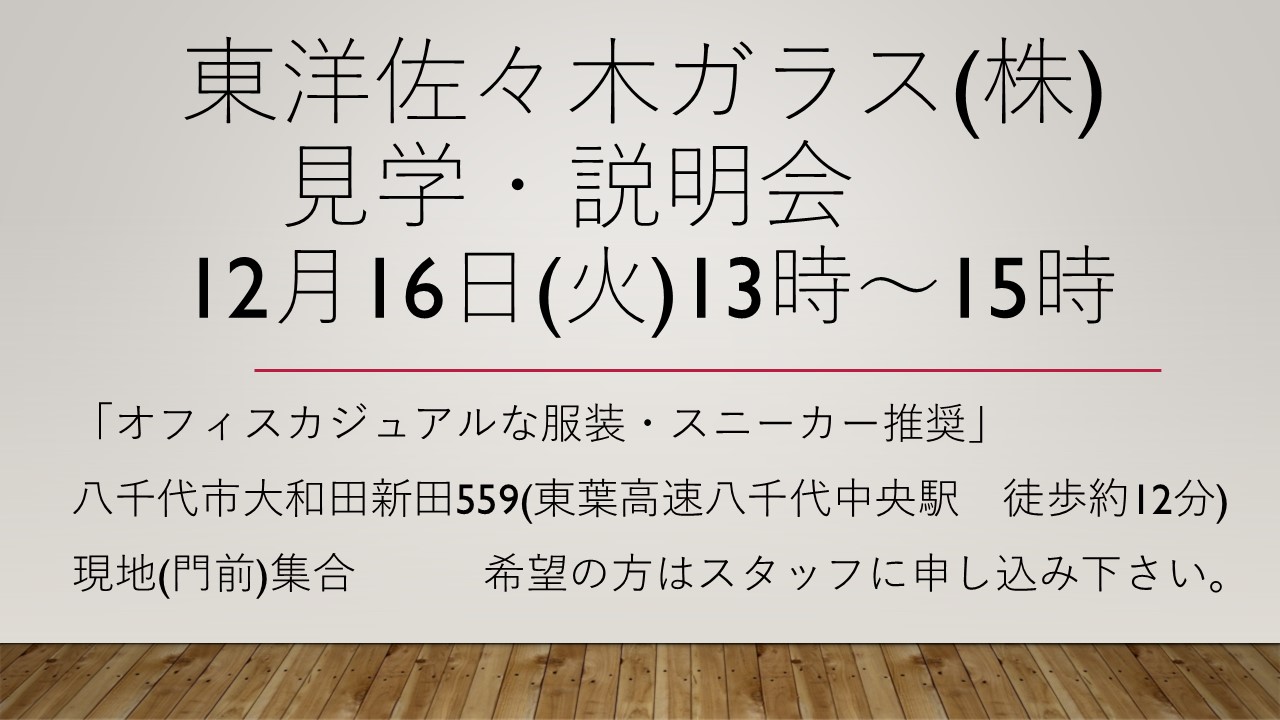 東洋佐々木ガラス(株)様 の見学・説明会を開催します。 日時:12/16(火)13:00~ ※オフィスカジュアルな服装・スニーカー推奨 ※現地集合となります。 ご希望の方は、スタッフまでお問合せ・ご予約ください。