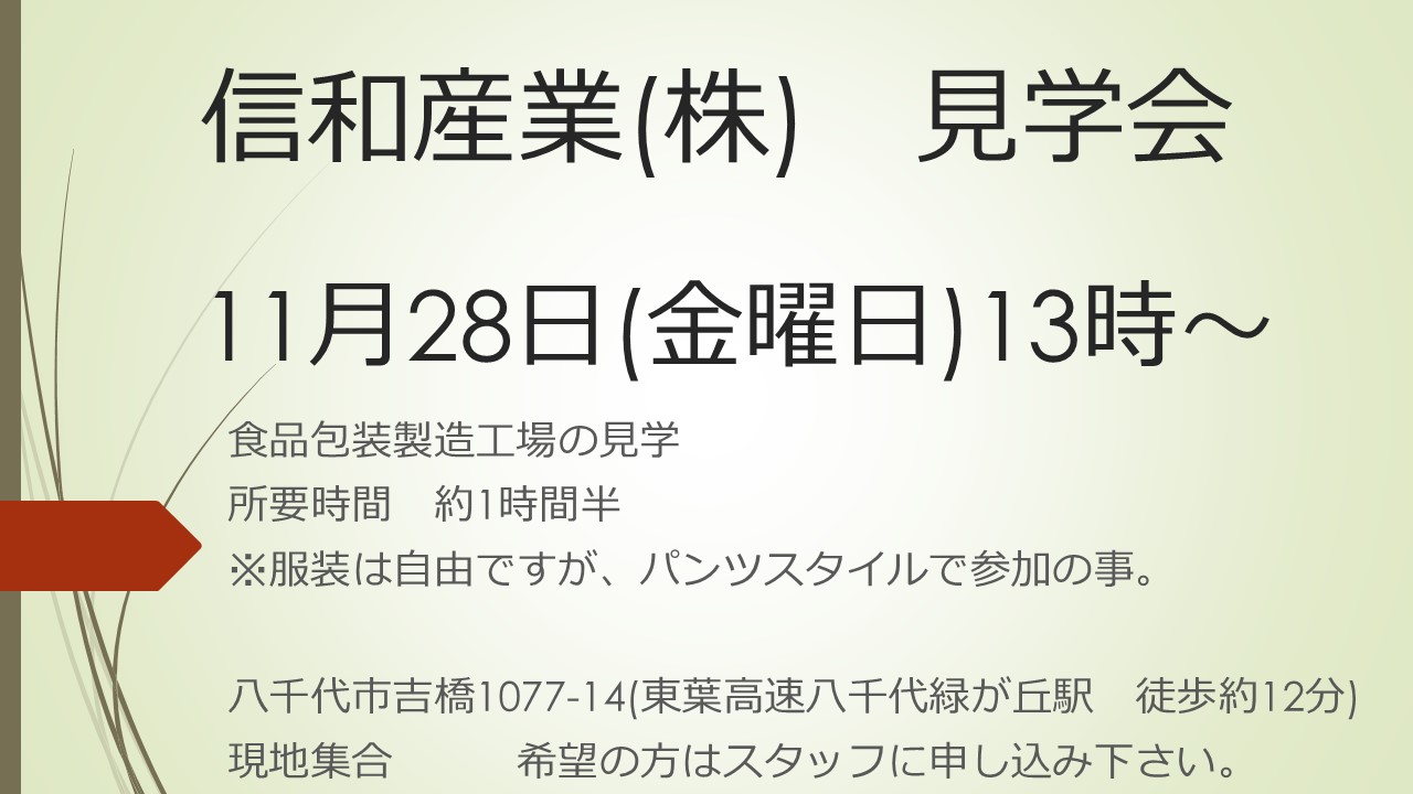 信和産業(株)様 の見学会を開催します。 日時:11/28(金)13:00~ ※服装は自由ですが、パンツスタイルで参加ください。 ご希望の方は、スタッフまでお問合せ・ご予約ください。