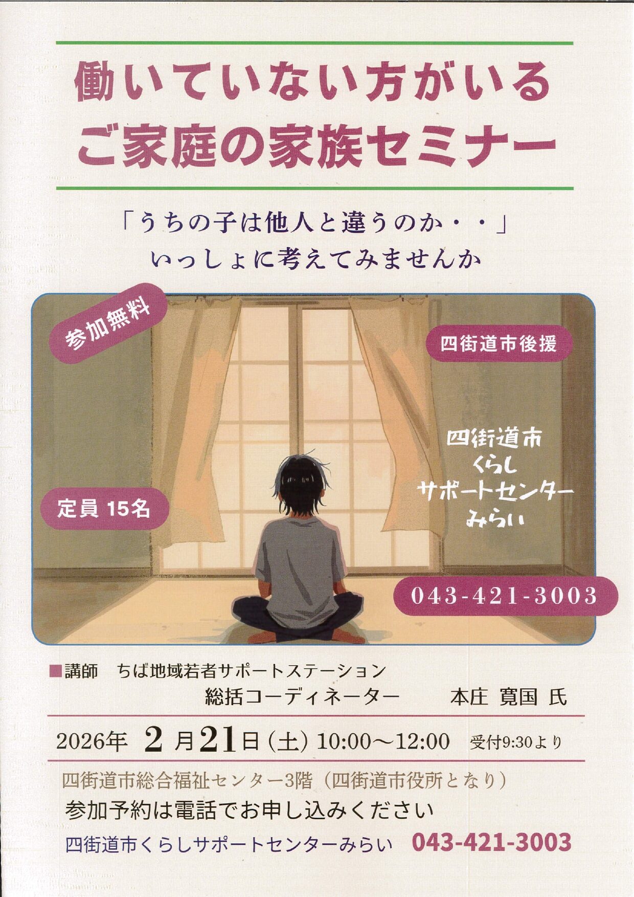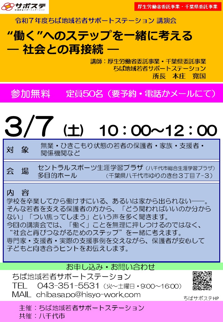 “働く”へのステップを一緒に考える ― 社会との再接続 ― をテーマに、講演会を開催します。 【日時】3/7 (土)10:00~12:00 【対象】無業・ひきこもり状態の若者の保護者・家族・支援者・関係機 […]