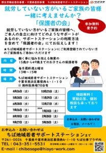 チラシ・ポスター_保護者の会 イベント・プログラム新着記事 2/6(金)13:00~ふなサポ主催合同企業説明会開催のお知らせ ⛄冬季休所のお知らせ🎍 1月特別講座のお知らせ 🎍1月のプログラムが決まりました! ブログ新着記事 【なりたい姿を考える】特別講座開催いたしました!~プログラム通信 「自分を知ろう!自分に合った将来~自分を説明する」特別講座開催いたしました!~プログラム通信 新しい風!「声で広がる新しい自分」開講!~プログラム通信 ちばサポステについて「ChatGPTにブログを書いてもらったら…」