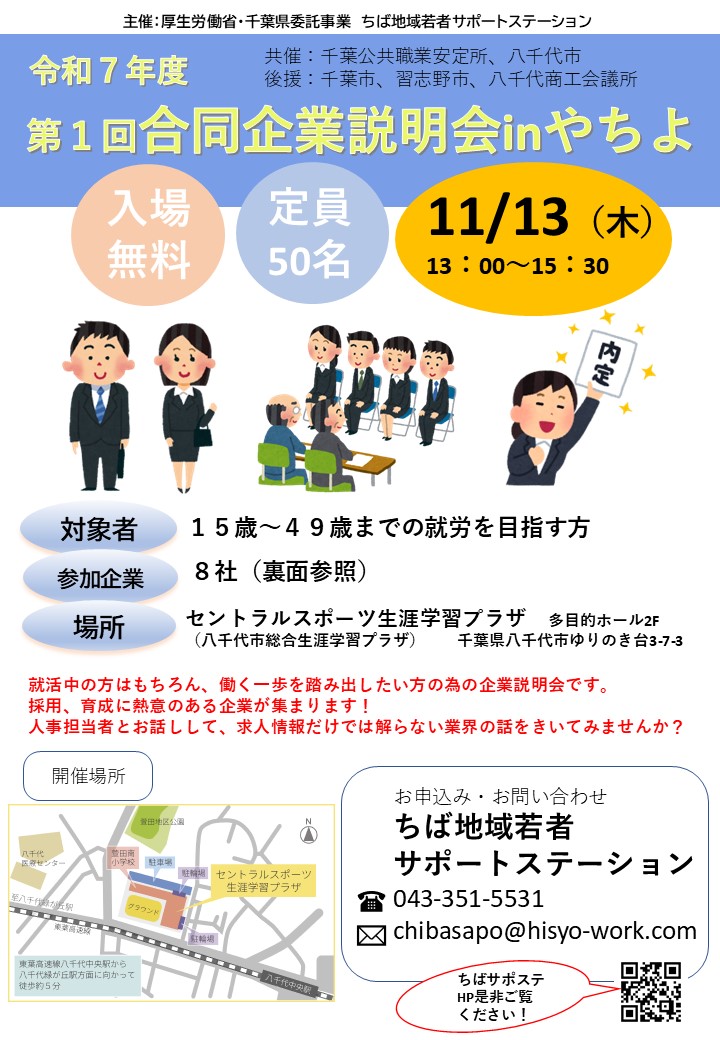 R7第1回合同企業説明会inやちよチラシデータ表 イベント・プログラム新着記事 2/6(金)13:00~ふなサポ主催合同企業説明会開催のお知らせ ⛄冬季休所のお知らせ🎍 1月特別講座のお知らせ 🎍1月のプログラムが決まりました! ブログ新着記事 【なりたい姿を考える】特別講座開催いたしました!~プログラム通信 「自分を知ろう!自分に合った将来~自分を説明する」特別講座開催いたしました!~プログラム通信 新しい風!「声で広がる新しい自分」開講!~プログラム通信 ちばサポステについて「ChatGPTにブログを書いてもらったら…」