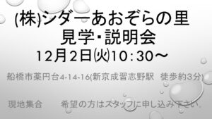 【職場見学・説明会のお知らせ】12/2(火)10:30~ 株式会社シダー あおぞらの里 様 (株)シダーあおぞらの里 様の見学・説明会を開催します。 日時:12/2(火)10:30~ ご希望の方は、スタッフまでお問合せ・ご予約ください。 【職場見学のお知らせ】11/28(金)13:00~ 信和産業株式会社 様 【職場見学のお知らせ】12/4(木)13:00~ オーケー八千代緑が丘店 様 イベント・プログラム新着記事 【職場見学のお知らせ】12/9(火)14:00~ ワタキューセイモア株式会社 様 【職場見学のお知らせ】12/5(金)14:00~ 株式会社シルバーとっぷ 様 【職場見学のお知らせ】12/4(木)13:00~ オーケー八千代緑が丘店 様 【職場見学・説明会のお知らせ】12/2(火)10:30~ 株式会社シダー あおぞらの里 様 ブログ新着記事 【なりたい姿を考える】特別講座開催いたしました!~プログラム通信 「自分を知ろう!自分に合った将来~自分を説明する」特別講座開催いたしました!~プログラム通信 新しい風!「声で広がる新しい自分」開講!~プログラム通信 ちばサポステについて「ChatGPTにブログを書いてもらったら…」