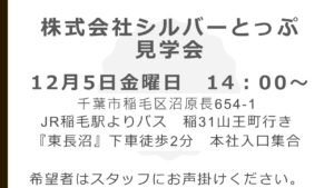 【職場見学のお知らせ】12/5(金)14:00~ 株式会社シルバーとっぷ 様 (株)シルバーとっぷ様 の見学会を開催します。 日時:12/5(金)14:00~ ※オフィスカジュアル推奨です。 ご希望の方は、スタッフまでお問合せ・ご予約ください。 【職場見学のお知らせ】12/4(木)13:00~ オーケー八千代緑が丘店 様 【職場見学のお知らせ】12/9(火)14:00~ ワタキューセイモア株式会社 様 イベント・プログラム新着記事 【職場見学のお知らせ】12/9(火)14:00~ ワタキューセイモア株式会社 様 【職場見学のお知らせ】12/5(金)14:00~ 株式会社シルバーとっぷ 様 【職場見学のお知らせ】12/4(木)13:00~ オーケー八千代緑が丘店 様 【職場見学・説明会のお知らせ】12/2(火)10:30~ 株式会社シダー あおぞらの里 様 ブログ新着記事 【なりたい姿を考える】特別講座開催いたしました!~プログラム通信 「自分を知ろう!自分に合った将来~自分を説明する」特別講座開催いたしました!~プログラム通信 新しい風!「声で広がる新しい自分」開講!~プログラム通信 ちばサポステについて「ChatGPTにブログを書いてもらったら…」