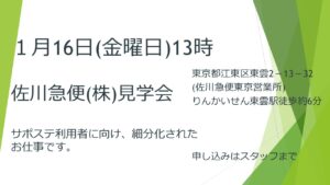 ★変更★【職場見学のお知らせ】1/16(金)13:00~ 佐川急便株式会社 様 ★当初1/14(水)を予定しておりましたが下記日程に変更になりました★ 佐川急便(株) 様 の見学会を開催します。 日時:1/16(金)13:00~ ご希望の方は、スタッフまでお問合せ・ご予約ください。 【職場見学・説明会のお知らせ】12/23(火)10:00~、13:30~ JR千葉鉄道サービス株式会社 様 イベント・プログラム新着記事 ★変更★【職場見学のお知らせ】1/16(金)13:00~ 佐川急便株式会社 様 【職場見学・説明会のお知らせ】12/23(火)10:00~、13:30~ JR千葉鉄道サービス株式会社 様 プログラム中止のお知らせ 12月特別講座のお知らせ ブログ新着記事 【なりたい姿を考える】特別講座開催いたしました!~プログラム通信 「自分を知ろう!自分に合った将来~自分を説明する」特別講座開催いたしました!~プログラム通信 新しい風!「声で広がる新しい自分」開講!~プログラム通信 ちばサポステについて「ChatGPTにブログを書いてもらったら…」
