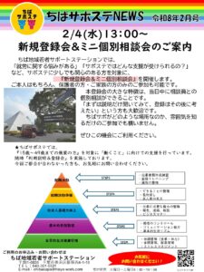 ちばサポNEWS2026年2月号 イベント・プログラム新着記事 3/13(金)合同企業説明会in四街道市 開催します!! 3/7 (土)10:00~講演会のお知らせ! 2/21(土)10:00~家族向けセミナーを開催します! 2月の職業人講話/特別講座のお知らせ ブログ新着記事 【なりたい姿を考える】特別講座開催いたしました!~プログラム通信 「自分を知ろう!自分に合った将来~自分を説明する」特別講座開催いたしました!~プログラム通信 新しい風!「声で広がる新しい自分」開講!~プログラム通信 ちばサポステについて「ChatGPTにブログを書いてもらったら…」
