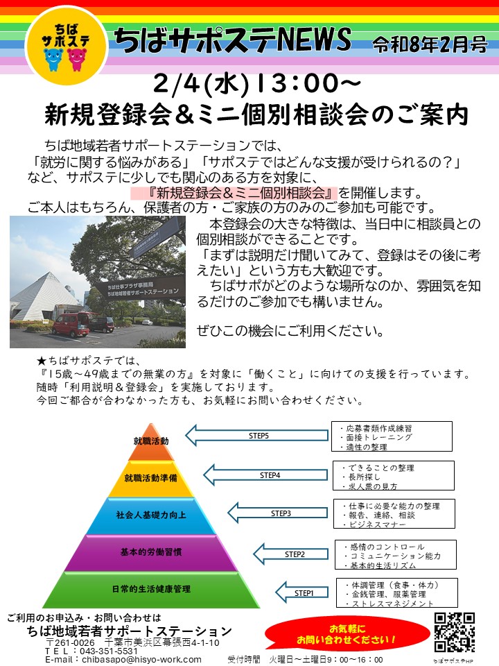 ちばサポNEWS2026年2月号 イベント・プログラム新着記事 3/13(金)合同企業説明会in四街道市 開催します!! 3/7 (土)10:00~講演会のお知らせ! 2/21(土)10:00~家族向けセミナーを開催します! 2月の職業人講話/特別講座のお知らせ ブログ新着記事 【なりたい姿を考える】特別講座開催いたしました!~プログラム通信 「自分を知ろう!自分に合った将来~自分を説明する」特別講座開催いたしました!~プログラム通信 新しい風!「声で広がる新しい自分」開講!~プログラム通信 ちばサポステについて「ChatGPTにブログを書いてもらったら…」