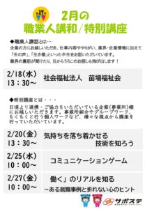 特別講座2月 イベント・プログラム新着記事 3/13(金)合同企業説明会in四街道市 開催します!! 3/7 (土)10:00~講演会のお知らせ! 2/21(土)10:00~家族向けセミナーを開催します! 2月の職業人講話/特別講座のお知らせ ブログ新着記事 【なりたい姿を考える】特別講座開催いたしました!~プログラム通信 「自分を知ろう!自分に合った将来~自分を説明する」特別講座開催いたしました!~プログラム通信 新しい風!「声で広がる新しい自分」開講!~プログラム通信 ちばサポステについて「ChatGPTにブログを書いてもらったら…」