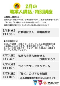 職業人講話 特別講座2月 イベント・プログラム新着記事 3/13(金)合同企業説明会in四街道市 開催します!! 3/7 (土)10:00~講演会のお知らせ! 2/21(土)10:00~家族向けセミナーを開催します! 2月の職業人講話/特別講座のお知らせ ブログ新着記事 【なりたい姿を考える】特別講座開催いたしました!~プログラム通信 「自分を知ろう!自分に合った将来~自分を説明する」特別講座開催いたしました!~プログラム通信 新しい風!「声で広がる新しい自分」開講!~プログラム通信 ちばサポステについて「ChatGPTにブログを書いてもらったら…」